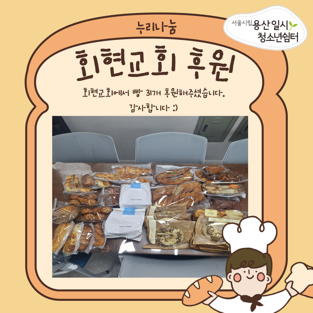 회현교회에서 청소년들을 위해 빵 31개를 후원해주셨습니다.